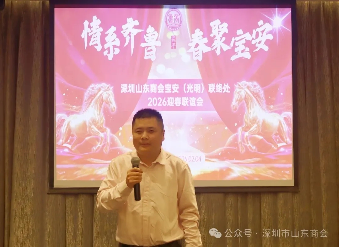 骏马启新程,乡情暖鹏城。2月4日,“情系齐鲁 春聚宝安”宝安(光明)联络处2026迎春联谊会成功举办。我会监事长梁尚迎,执行会长王凌鸿、张永军、王占贵、李正文,秘书长张新英,副会长吴军、王纪霞、臧桂福、王庆社、杜江涛、李建海、谷立柱,副监事长吕新安以及本联络处会员,商会副秘书长、宝安光明片区的山东老乡等齐聚一堂,辞旧迎新话乡情、共赴马年奋进之约。