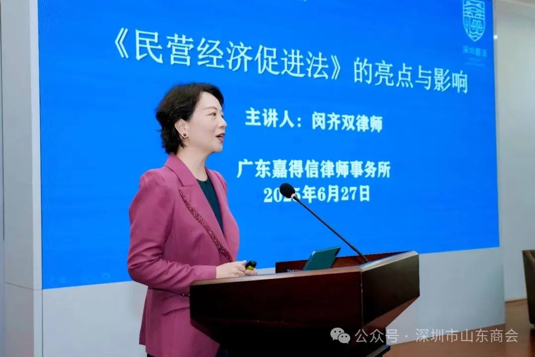 发布仪式上,与会嘉宾听取了由律师代表闵齐双所作的普法讲座。闵齐双以《<民营经济促进法>的亮点与影响》为主题,从《民营经济促进法》的立法背景、立法亮点、实施影响等方面,为企业解析国家在立法层面对民营经济的保护扶持,并结合典型案例详细讲解企业合规经营要点。在互动交流环节,南山法院法官针对企业代表提出的股权纠纷、财产保全、商业秘密等问题“一对一”解疑答惑。