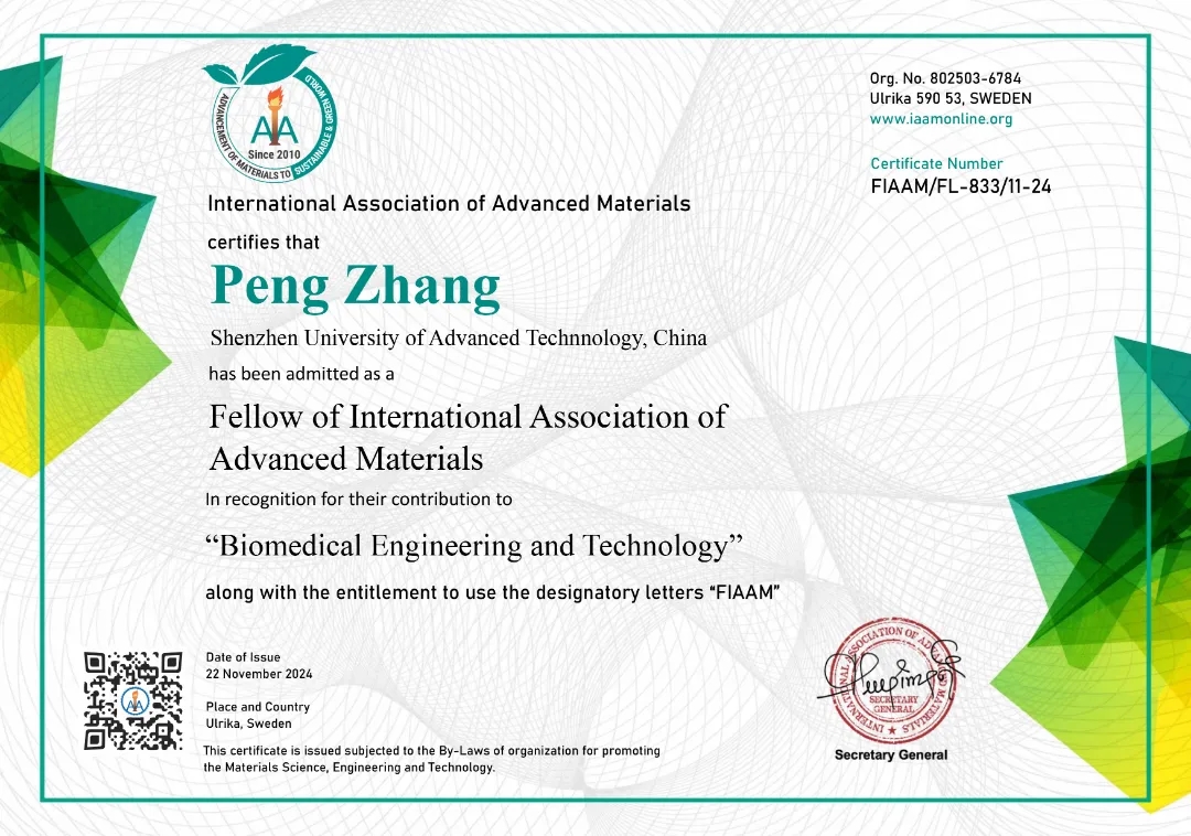 近日,深圳理工大学生物医学工程学院特聘杰出教授张鹏当选为“国际先进材料学会会士”(FIAAM),以表彰他在生物医学工程与技术领域所作出的突出贡献。